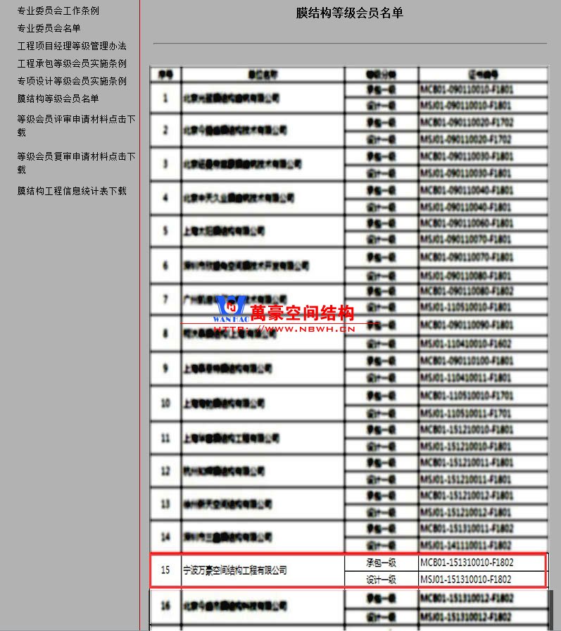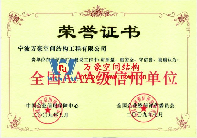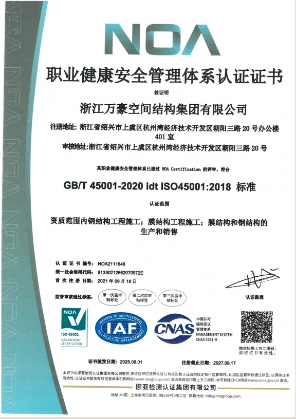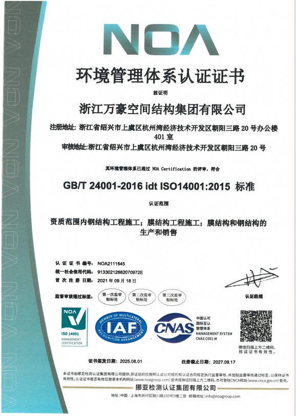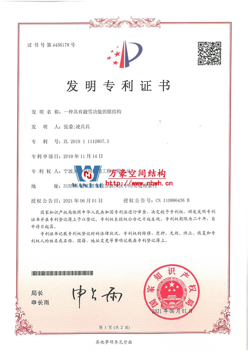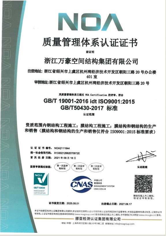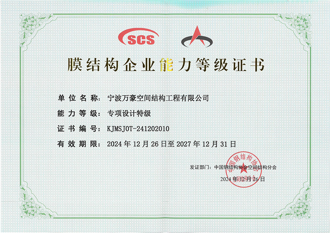 • 膜結構工程總承包特級(設計、制作、安裝)資質,鋼結構工程二級資質