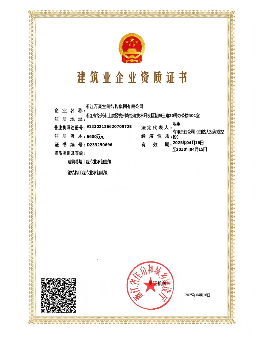 • 鋼結構工程二級、建筑幕墻一級證書 發證機構: