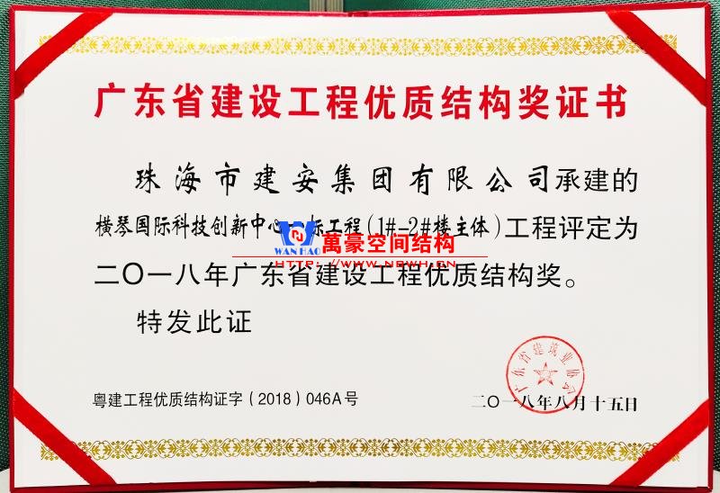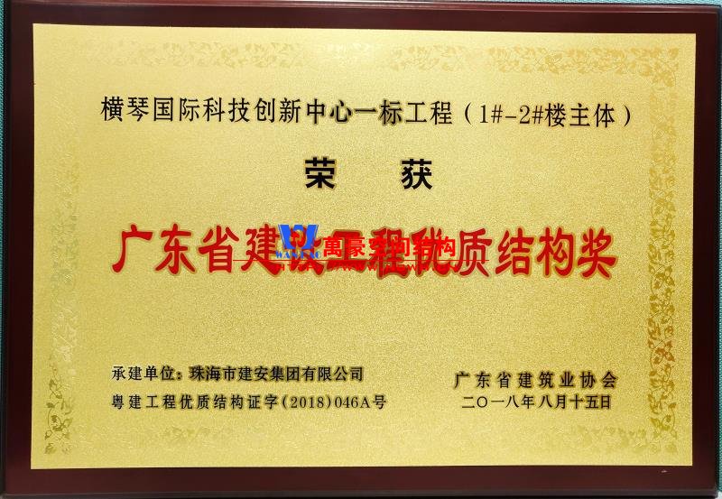 • 廣東橫琴工程優質結構獎 發證機構: