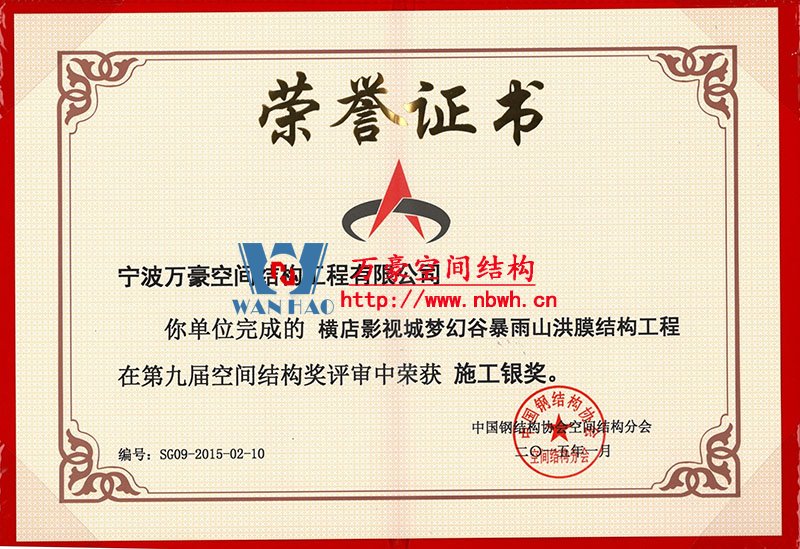 • 橫店夢幻谷膜結構施工銀獎 發證機構: