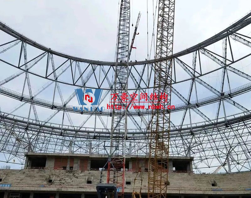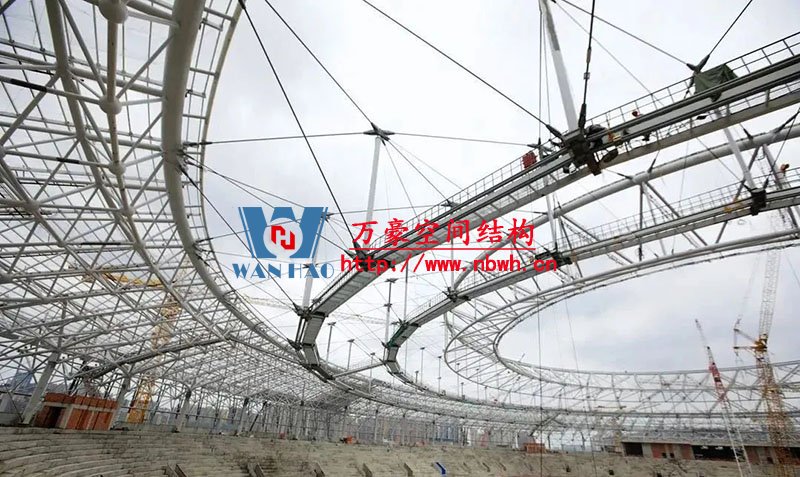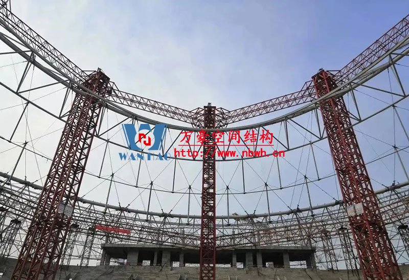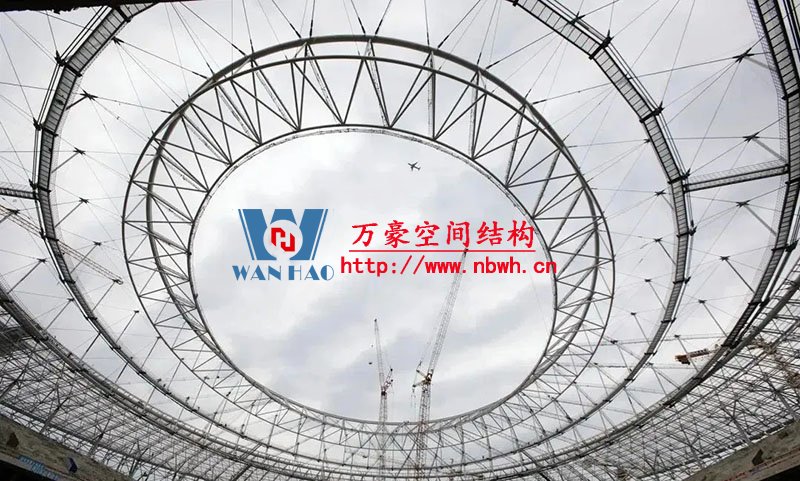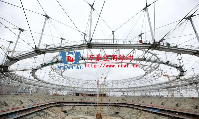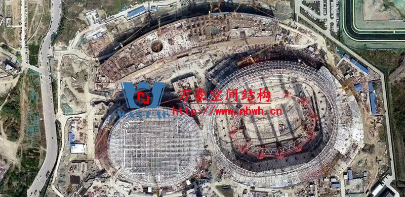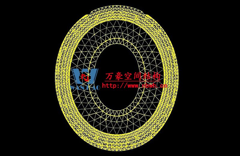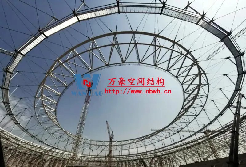 編者按:鳳凰山體育公園專業(yè)足球場屋蓋是全國首例大開口索穹頂結(jié)構(gòu),最大懸挑跨度約64米,南北跨度約279米,東西跨度234米。外環(huán)為雙層網(wǎng)殼,內(nèi)環(huán)為三角形立體桁架(南端低北端高,最高點標高為63米),外環(huán)和內(nèi)環(huán)之間為葵花形索穹頂。