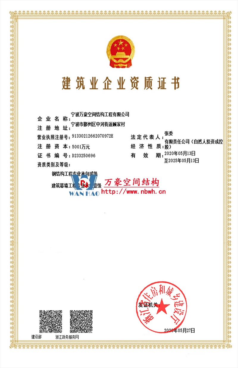 • 膜結構工程總承包特級(設計、制作、安裝)資質,鋼結構工程二級資質