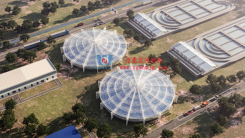 污水池加蓋是一種節能環保舉措,膜結構的使用不僅解決了污水池內廢氣的污染現象,而且對廢氣的治理達到排放要求。傳統的污水池加蓋方式有玻璃鋼加蓋,陽光板加蓋等,但是,隨著污水池廢氣污染的不斷嚴重,傳統的污水池加蓋措施已經不能滿足日益嚴重的廢氣污染要求,而且對玻璃鋼或者陽光板造成不同程度的腐蝕,降低了污水池加蓋的除臭率。
