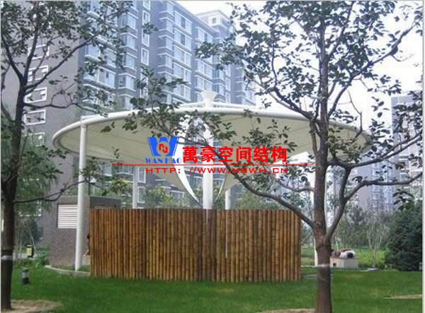 景觀膜結構工程的主要原材料是張拉膜結構,張拉膜結構以其輕盈飄逸的造型、柔美并帶有力量的曲線和大跨度和大空間的鮮明個性和標識性,應用于城市小品設計中。 景觀城市小品就是我們人類生活在這個地球上,當今生活中所必須的一些設施,例如電話亭、電子屏、廣場、候車亭、街鐘、拉圾桶、墻壁燈、藤架、通風口投光燈、飲水臺、裝飾門、坐椅等等。