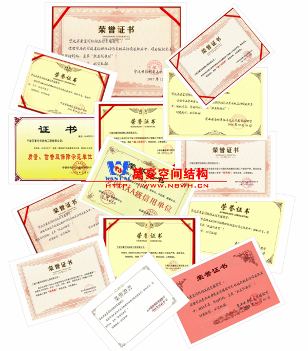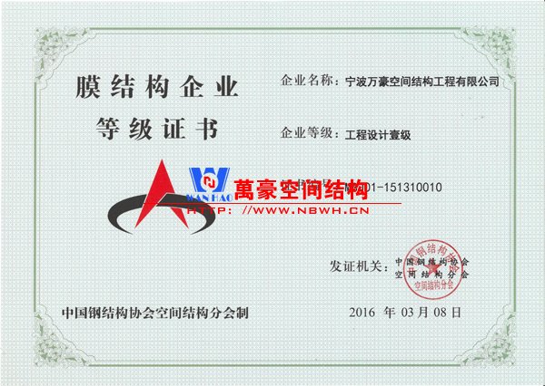 • 膜結構工程總承包特級(設計、制作、安裝)資質,鋼結構工程二級資質