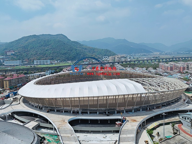 平陽體育中心設(shè)計功能為1.5萬座中型乙級體育場及其配套用房,總建筑面積49610平方米,其中鋼結(jié)構(gòu)約3800噸、PTFE膜結(jié)構(gòu)展開面積約25000平方。體育場鋼結(jié)構(gòu)工程鋼柱采用箱型焊接截面,屋蓋采用19種不同跨度懸挑鋼桁架結(jié)構(gòu),節(jié)點均采用相貫焊接節(jié)點。屋面覆索膜結(jié)構(gòu),PTFE膜結(jié)構(gòu)的使用,增加了整個體育場的空間感和動態(tài)感,也讓體育館成為了平陽當(dāng)?shù)氐囊曈X焦點。