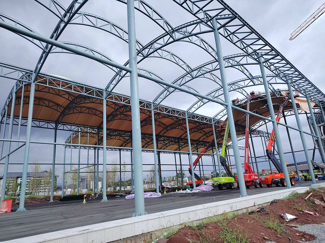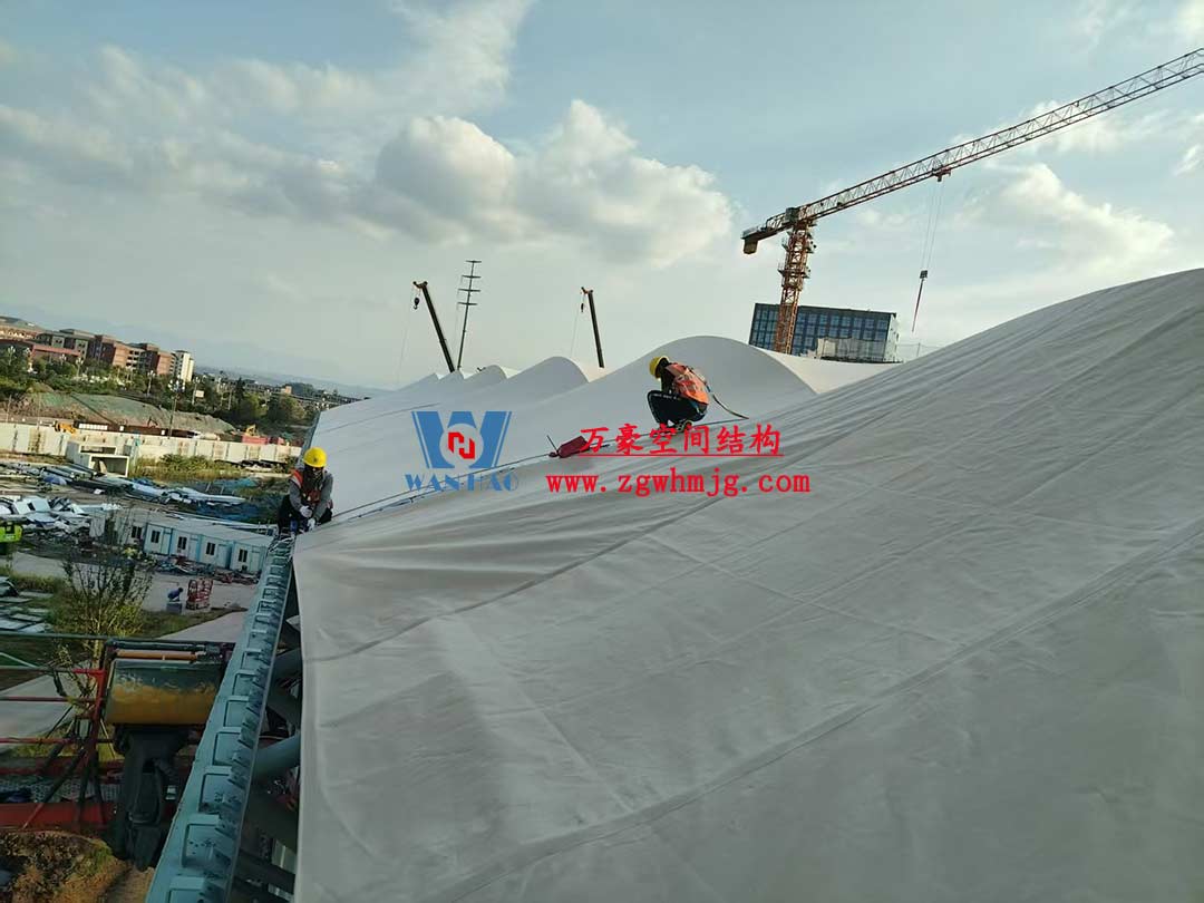 四川廣安共享體育場網球館膜結構位于廣安區官盛新區,是廣安共享體育場的一部分,PTFE膜結構展開面積5500平方米