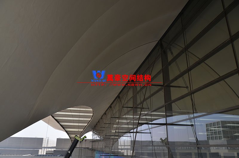萬豪膜結構承建了此項目的幕墻工程,現場測量、深化設計、制作及安裝由寧波萬豪全權負責;該工程用鋼量1000多噸,PTFE室內屋面膜結構展開面積17000多平方米,PTFE室外屋面膜結構展開面積20000多平方米。