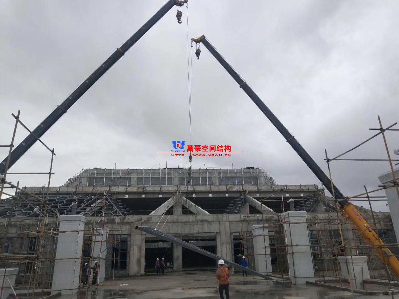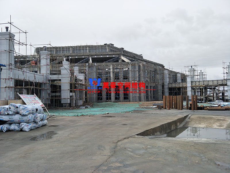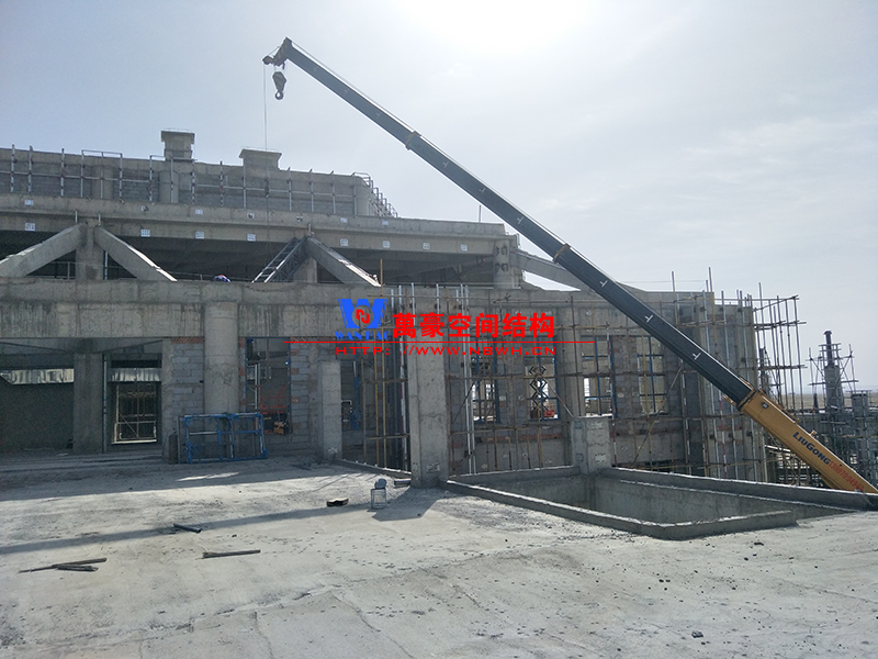 該項目主要分為兩個部分,分別是綜合辦公樓鋼膜結構項目和觀光塔鋼膜結構項目,總用鋼量500噸,膜結構展開面積4000平米。 目前,主樓六邊形、二樓斜屋面每面四根大梁已全部安裝完畢,現在一個面的其他鋼構正在安裝中,穹頂大梁框架完成。 期待工程早日完工,為萬豪再添輝煌。