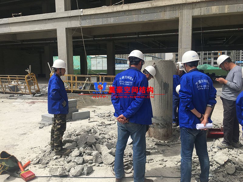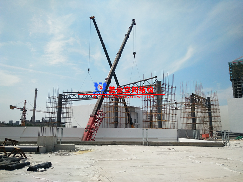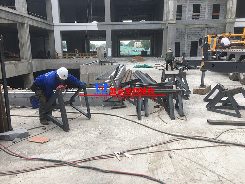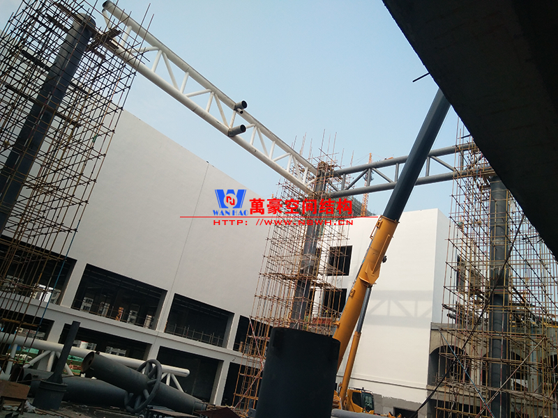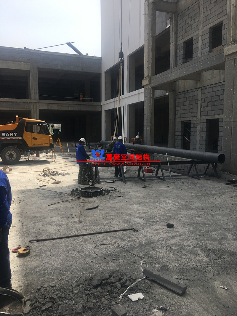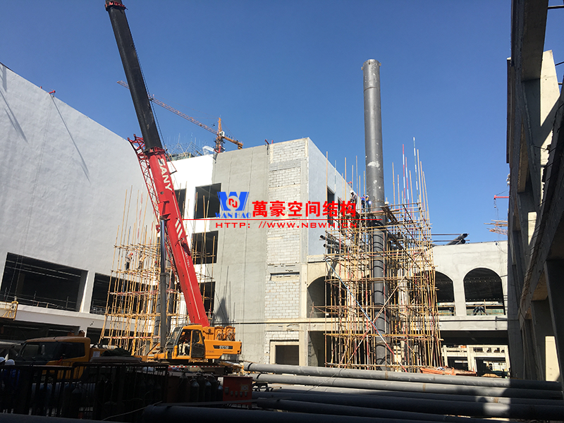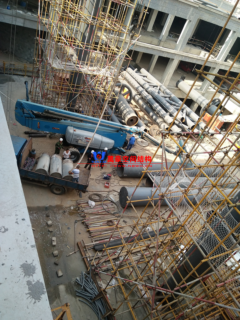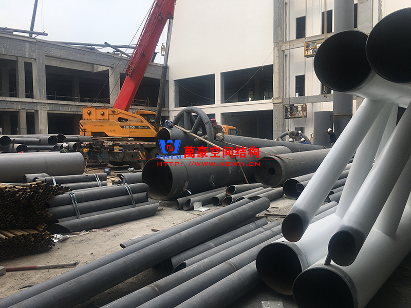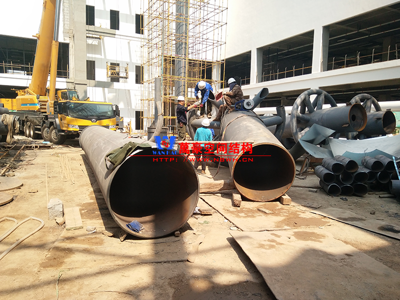 目前一號云朵鋼柱立起3根,懸挑管架全部拼裝完畢,桁架拼裝完成;二號云朵鋼柱立起3根,桁架、漏斗已基本到位,懸挑構(gòu)件焊接中;三號云朵鋼柱焊接中,隔板、環(huán)板正在有序拼裝。