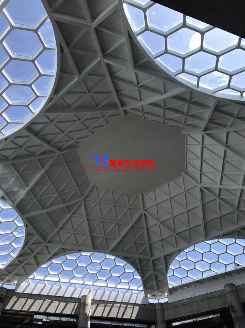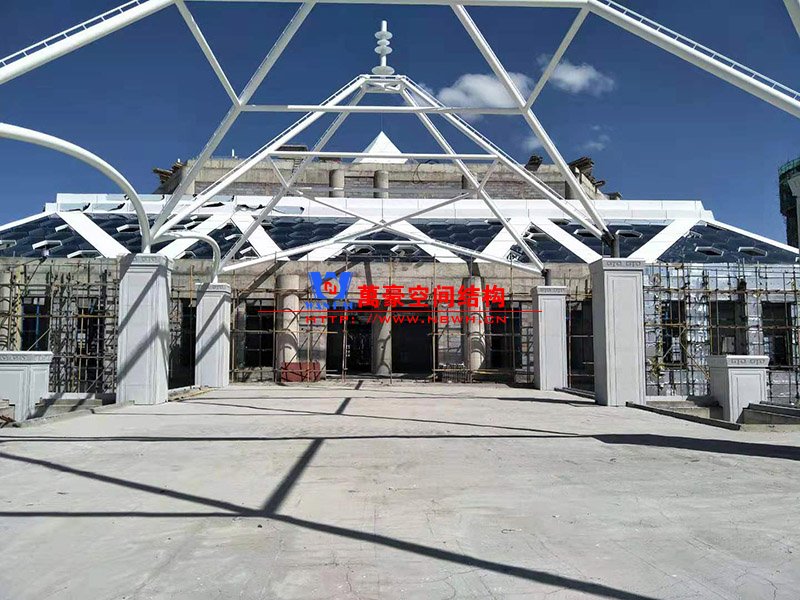 目前觀光塔鋼構(gòu)已完成五層,六個連廊已完成四個吊裝,穹頂及二樓斜屋面已基本完成。