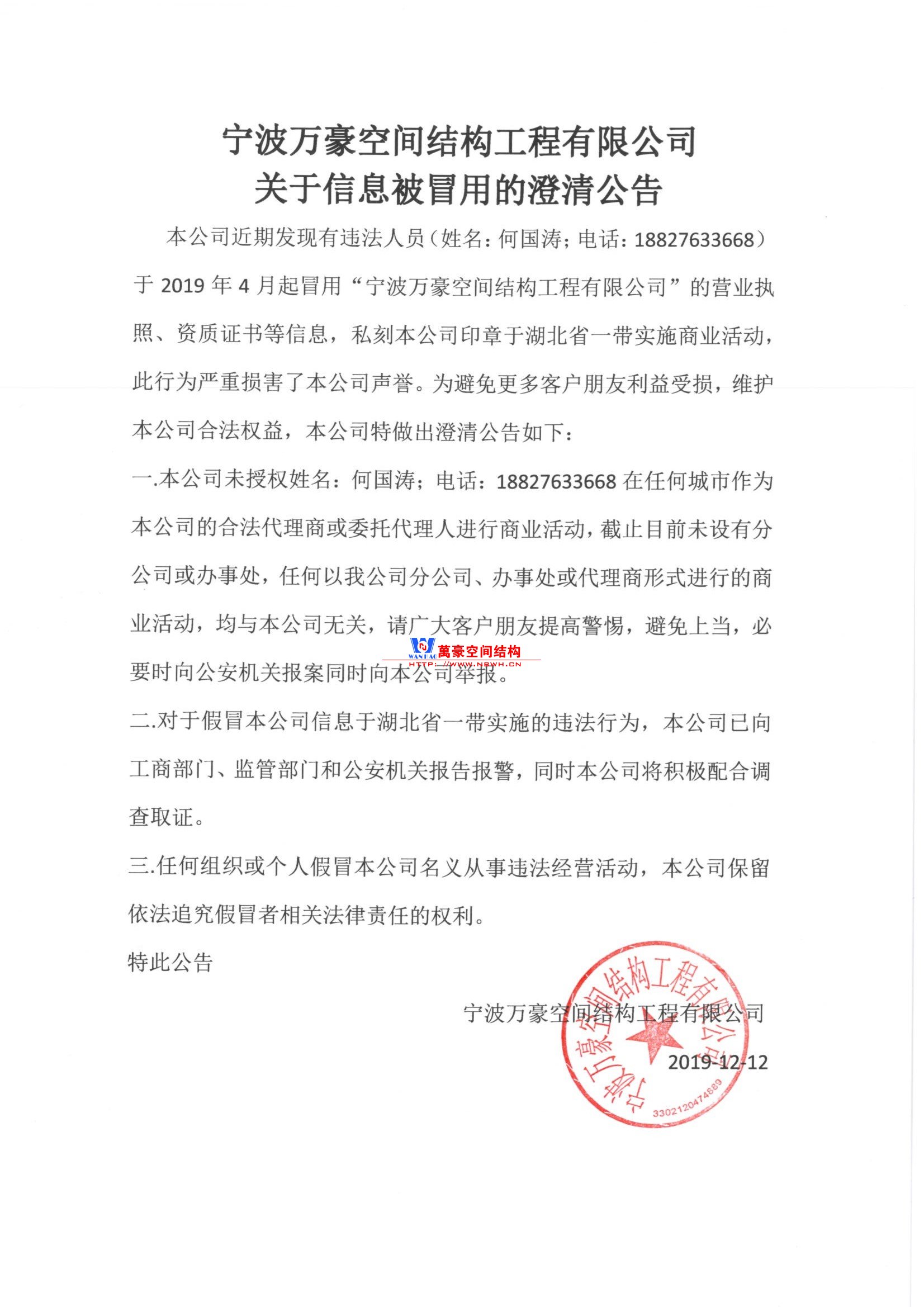 本公司近期發(fā)現(xiàn)有違法人員(姓名:何國(guó)濤;電話:18827633668)于2019年4月起冒用“寧波萬豪空間結(jié)構(gòu)工程有限公司”的營(yíng)業(yè)執(zhí)照、資質(zhì)證書等信息,私刻本公司印章于湖北省一帶實(shí)施商業(yè)活動(dòng),此行為嚴(yán)重?fù)p害了本公司聲譽(yù)。為避免更多客戶朋友利益受損,維護(hù)本公司合法權(quán)益,本公司特做出澄清公告如下: