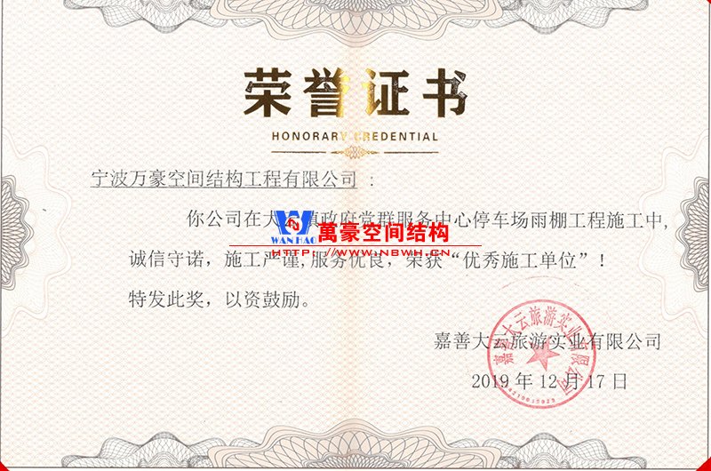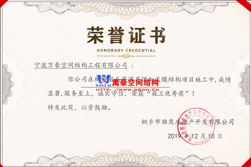 萬豪桐鄉寶馬花園屋頂加蓋膜結構項目榮獲施工優秀獎!