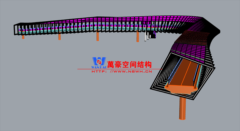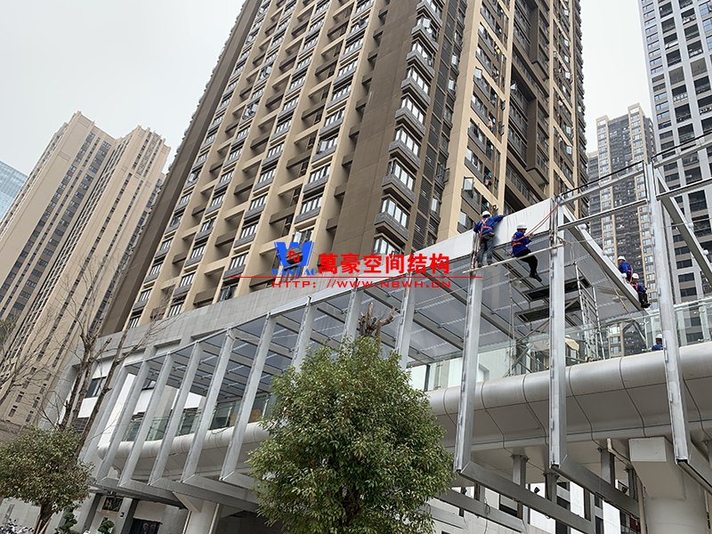 深圳龍崗三館一城項(xiàng)目市政配套工程1號(hào)連廊膜結(jié)構(gòu)工程項(xiàng)目為單層ETFE膜結(jié)構(gòu),共劃分為101個(gè)單元,總面積約為2000㎡,由寧波萬豪空間結(jié)構(gòu)工程有限公司承建。膜結(jié)構(gòu)原材采用德國NOWOFOL-300μm鍍點(diǎn)ETFE材料,保證透光率的同時(shí),兼顧防范紫外線。膜結(jié)構(gòu)四周利用鋁合金夾具固定于主鋼結(jié)構(gòu)二次構(gòu)件上,膜面采用PE鋼索輔助支撐,確保膜面有效承擔(dān)相應(yīng)動(dòng)荷載。