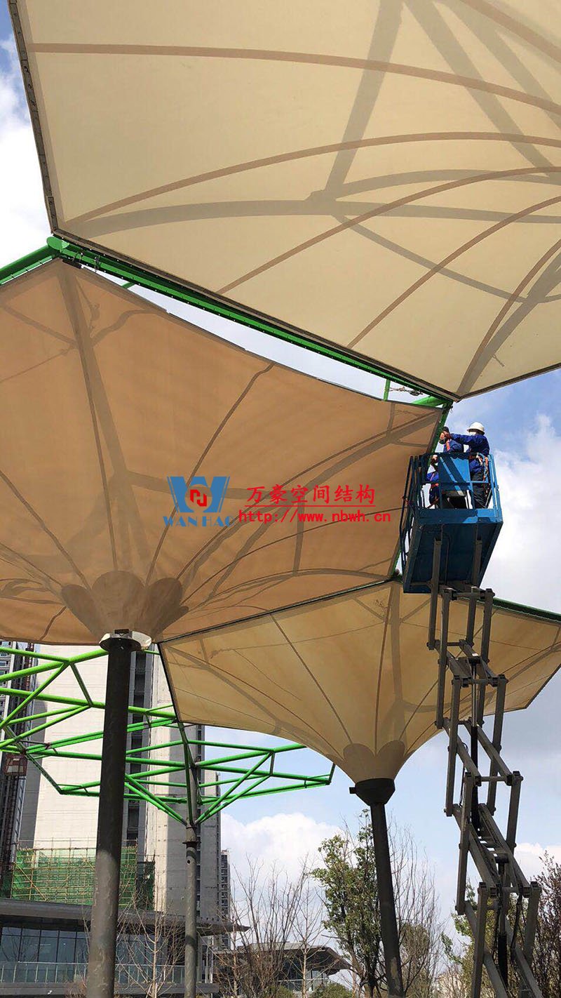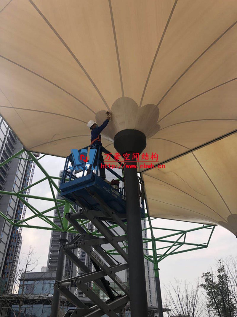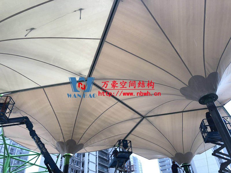 五鄉地鐵站傘狀PTFE膜結構工程位于浙江省寧波市楊柳郡,項目由19座倒傘膜結構組成,倒傘寓意盛開的牽牛花。 該項目膜材使用進口PTFE膜材,膜結構展開面積5000平米,用鋼量100噸,由寧波萬豪空間結構工程有限公司承建。 目前,該工程進入膜結構安裝階段。期待整個工程的完工,來領略它獨特的風采。