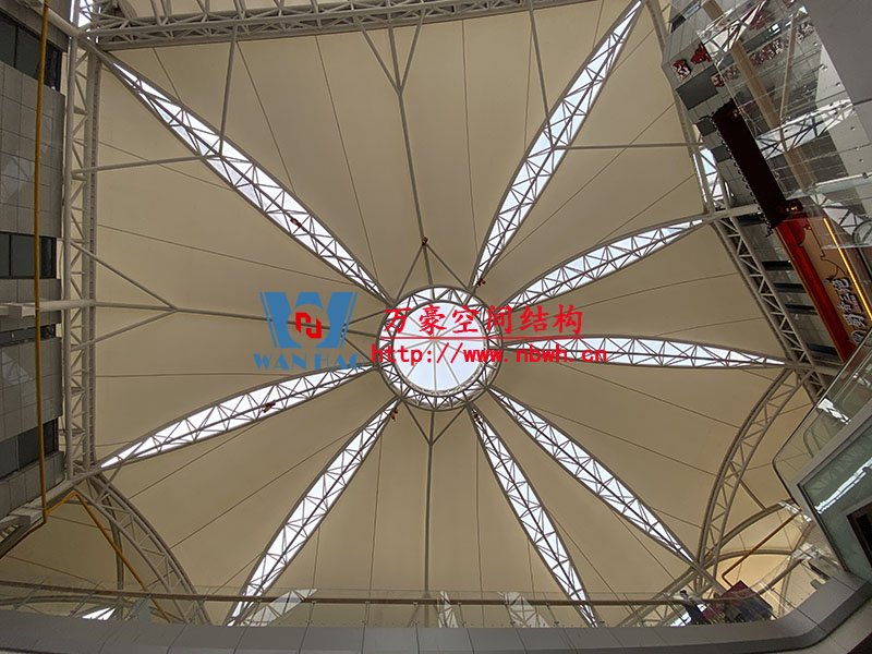 本屋面通廊加蓋項目由天幕雙曲面穹頂及四周通廊共同組合而成,其中穹頂部分主體結構由8片“魚腹式”空間曲面桁架與 “皇冠式”圓頂共同組合而成,穹頂選用高性能新型建筑材料純透明ETFE膜材。四周通廊采用空間曲面桁架,結合綜合體的采光要求,我們選用白色PVDF高自潔膜材與純透明ETFE膜材的有效結合,在夜幕燈光照耀下,更是光彩奪目。