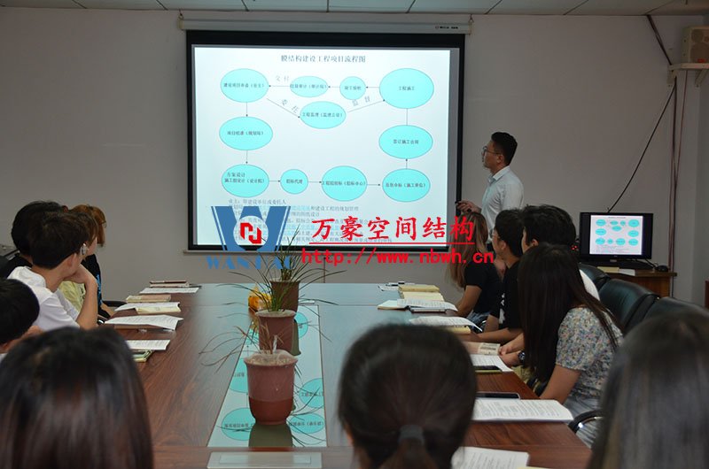 然后,我們的銷售主管教新員工們學習了公司晨會流程以及膜結構建設工程項目流程。