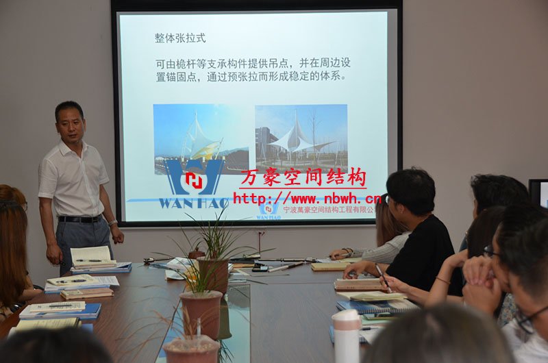 最后,由萬豪總經理張總給大家分享萬豪空間結構企業文化及全面的膜結構工程技術知識。內容包括膜結構行業發展現狀、膜材料分類、膜結構優勢及應用領域、膜結構產品結構形式等。