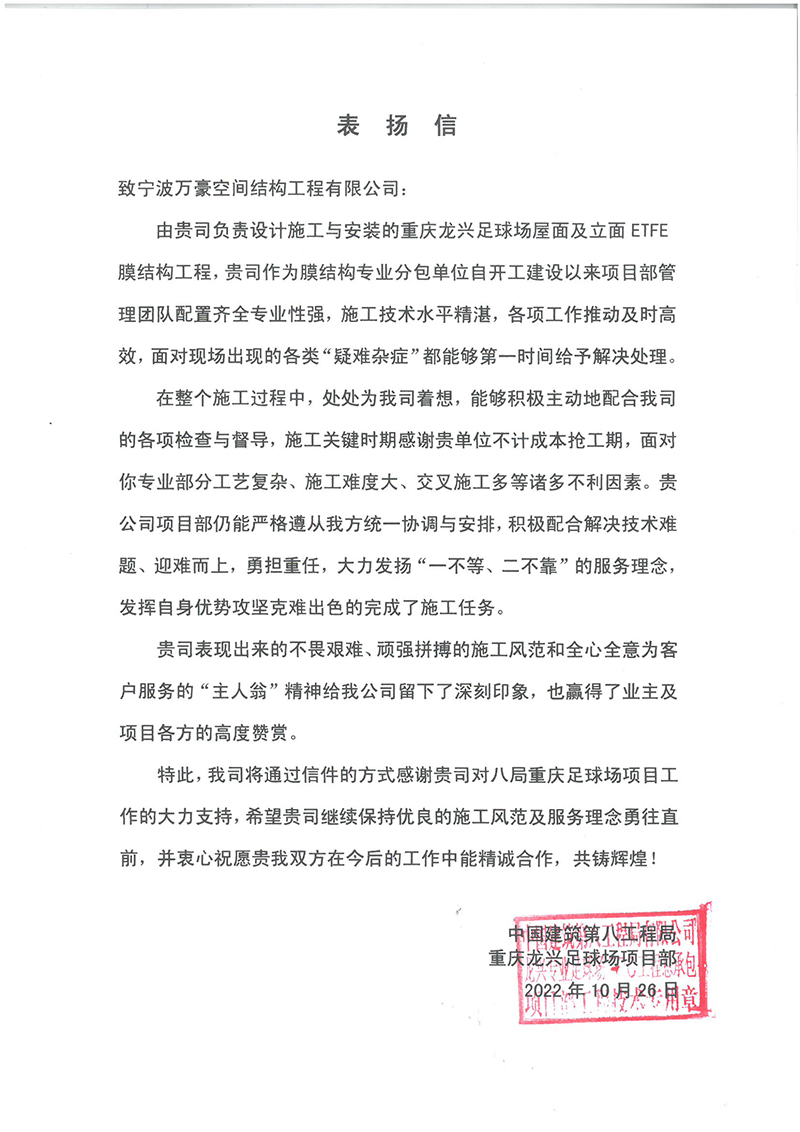 特此,中國建筑第八工程局重慶龍興足球場項目部致以定制錦旗與感謝信給與嘉獎。