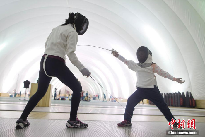 12月1日,一位學(xué)生在北京市某學(xué)校充氣膜體育館學(xué)習(xí)擊劍。11月29日空氣重污染橙色預(yù)警;11月30日霾橙色預(yù)警;12月1日大霧橙色預(yù)警。北京史上首次三個預(yù)警全“橙”發(fā)送。截至昨日,今年最嚴(yán)重空氣污染過程已持續(xù)了5天。昨夜,冷空氣抵達(dá)北京,霧霾逐漸消散。今起至4日,京城空氣優(yōu)良。昨日24時,市空氣重污染應(yīng)急指揮部解除北京空氣重污染橙色預(yù)警。 (來自:中國新聞網(wǎng))