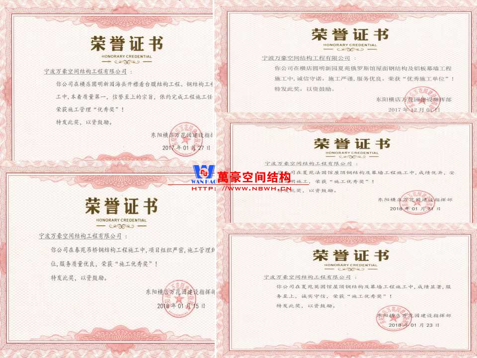 無論是膜結構工程,還是其他行業的工程,作為施工方,最大的褒獎莫過于業主的肯定。作為肯定的見證,為你頒發的榮譽證書是最好的證明。 大家還記得萬豪在橫店做的一系列膜結構工程嗎?所有的工程,全部獲得了業主的高度評價,全都獲得了榮譽證書。這就是實力的證明,這就是技術的展現。