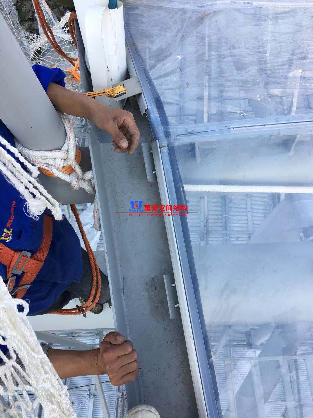 大家可以看到,已經(jīng)有幾處安裝上整塊的大膜了。接下來(lái)工作的重點(diǎn),就是把剩下的區(qū)域全部安裝上膜材。雖然過(guò)程比較艱辛,但是看著這項(xiàng)工程一步步的走向終點(diǎn),大家的斗志還是激昂的。