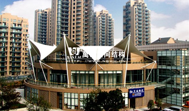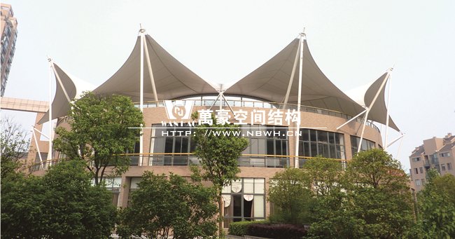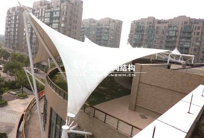 工程屹立在寧波鄞州區紫郡小區,作為小區售樓處屋頂景觀,整體工程有8片單體膜組成,每片單體膜展開面積約50平方米,結構造型飄逸輕盈,結構受力有墻體承載,為張拉式膜建筑的典型代表,膜材高低起伏,形如波濤拍岸。極具現代化氣息,和諧的融與環境,成為商業小區的一道亮麗風景線。